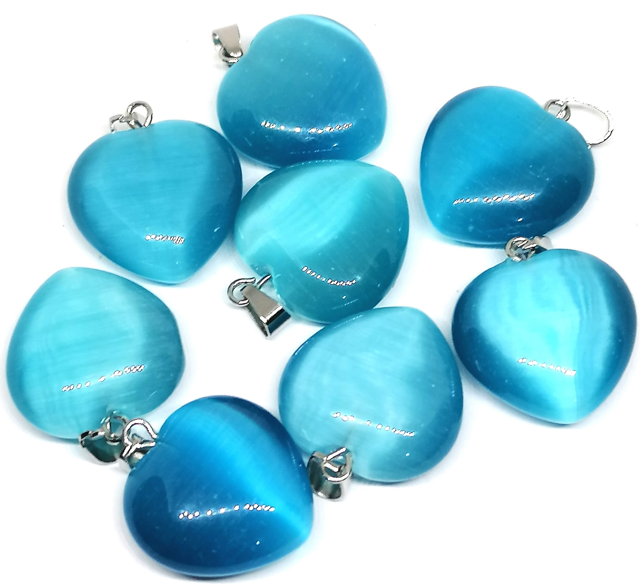 Ulexitové srdíčko modré (tzv. kočičí oko) – esoterický přívěsek o velikosti cca 20 mm. Úchytka je z bižuterního kovu bez obsahu niklu.