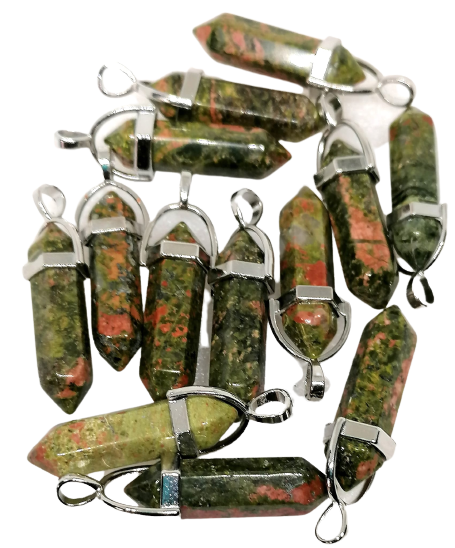 Unakitový krystal zvaný také HEXAGON je broušený do tvaru šestihranného hrotu, který zaujme svou přirozenou kombinací zelených a růžových tónů. Díky svému tvaru nemusí sloužit pouze jako přívěsek na krk, ale lze jej využít i jako kyvadlo.