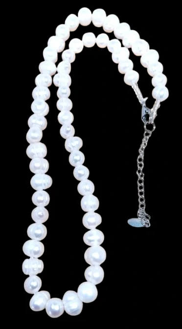 Elegantní náhrdelník z bílých říčních perel o velikosti cca 7–10 mm. Obvod náhrdelníku je přibližně 48 cm, komponenty jsou vyrobeny z kvalitní chirurgické oceli, která zajišťuje dlouhou životnost i pohodlné nošení. K tomuto náhrdelníku můžete zakoupit i stejný náramek (produkt č. 29PC).