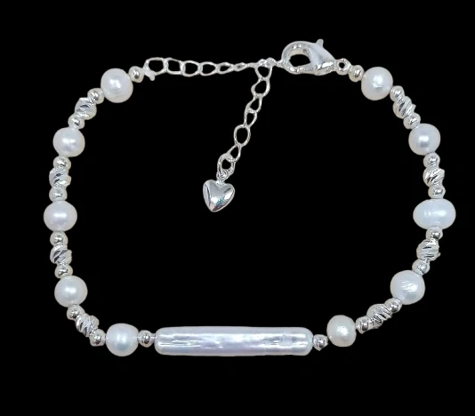Objevte nadčasovou eleganci s tímto luxusním náramkem z pravých říčních perel, tvořeným droboučkými, téměř kulatými perličkami o velikosti cca 5–6 mm. Jemnost a sofistikovaný vzhled doplňuje originální tyčinka z perleti, která dodává šperku unikátní charakter. Náramek má obvod 16 cm a je doplněn o 5 cm dlouhý prodlužovací řetízek, takže se dokonale přizpůsobí každému zápěstí.