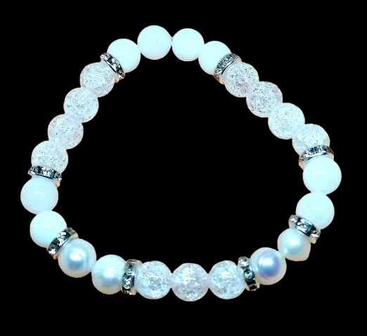 Elegatní náramek z perel kombinovaných s kuličkami bílého jadeitu a křišťálu. Použité komponenty jsou z bižuterního kovu..
