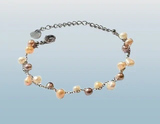 Elegantní a jemný náramek z drobných říčních perel různých přírodních odstínů – od bílé přes béžovou až po růžovou, šedou a lososovou – je osazen na řetízku z kvalitní chirurgické oceli, která je odolná, hypoalergenní a vhodná pro každodenní nošení.