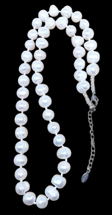 Elegantní náhrdelník z pravých říčních perel v bílé barvě s oválnými perlami o velikosti cca 1 × 0,8 cm. Celkový obvod náhrdelníku je cca 50 cm, navíc je doplněn prodlužovacím řetízkem 5 cm. Zapínání je z kvalitní chirurgické oceli, stejně jako všechny komponenty, což zajišťuje pevnost, dlouhou životnost a hypoalergenní vlastnosti.
