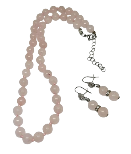 Elegantní náhrdelník z růženínu, v sadě s naušnicemi – jemný šperk s hlubokým významem.