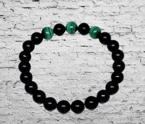 Exkluzivní šungitový náramek z pravého šungitu z Karelie, doplněný malachitem v AA kvalitě, který je silným ochranným kamenem. Dodává sebevědomí.