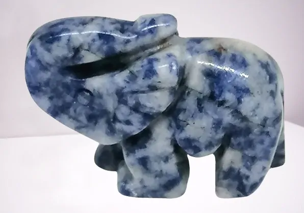 Krásná soška slona vyřezaná ze sodalitu, přírodního minerálu s typickou hlubokou modrou barvou a jemným bílým žilkováním. Tento dekorativní kámen je oblíbený nejen mezi sběrateli minerálů, ale také v esoterice a feng shui, kde je spojován s harmonií, klidem a jasností mysli.