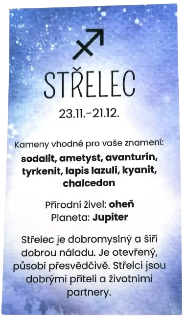 Střelec – kartička se znamením, charakteristikou a vhodnými kamenyihned 17 ks10 Kč/ ks8 Kč bez DPH