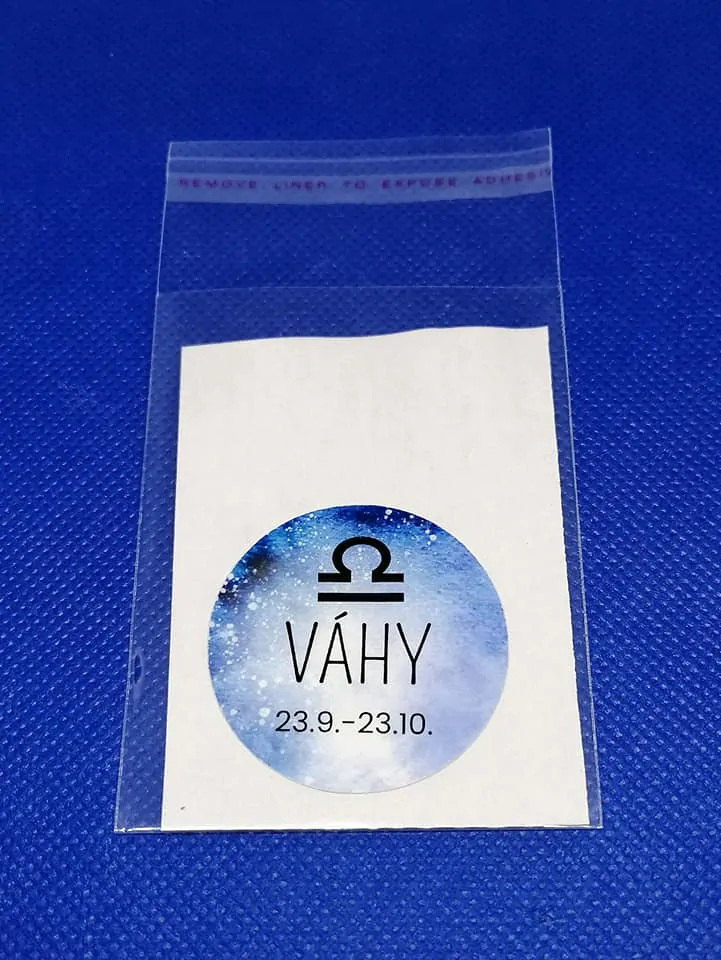 Celofánový sáček s nalepenou samolepkou na zabalení kamínku, náramku, prostě něčeho co se vztahuje k jednotlivým znamením zvěrokruhu.