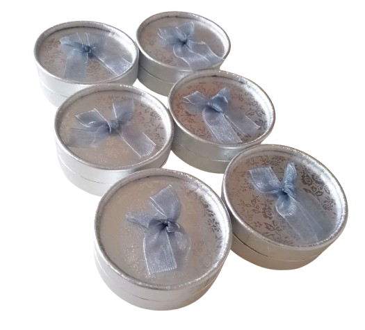 - Dárková krabička stříbrná kulatá (8 × 3 cm, velkoobchodní balení 12 ks)