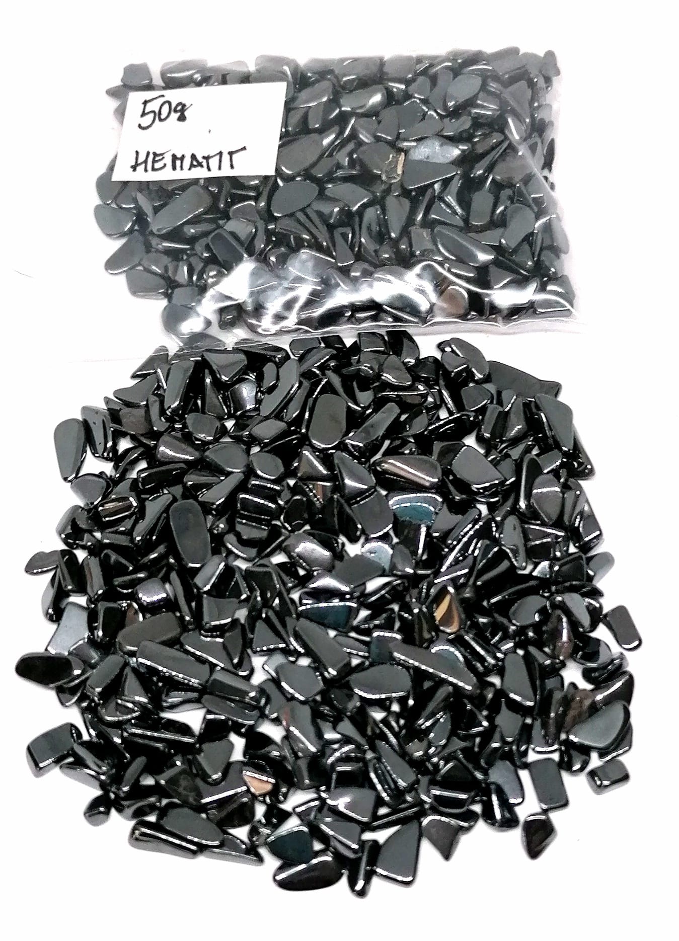 Na fotografii vidíte 50 g hematitu, pro představu. Tyto drobnější kamínky jsou vhodné na výrobu šperků, naplnění dekoračních nádob, kolem svíčky nebo na výrobu orgonitů.