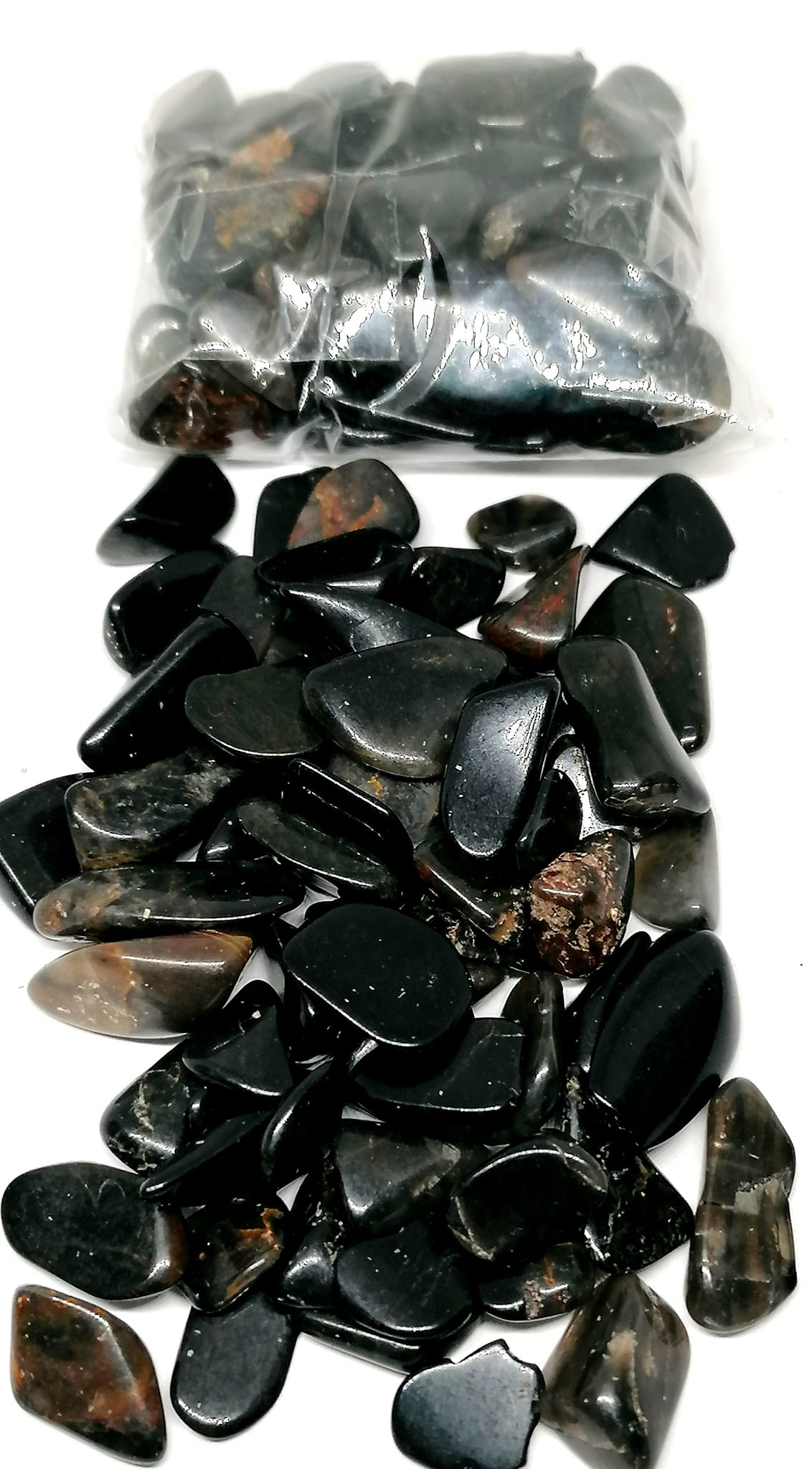 Na fotografii vidíte 100 g onyxu, pro představu. Tyto drobnější kamínky jsou vhodné na výrobu šperků, naplnění dekoračních nádob, kolem svíčky nebo na výrobu orgonitů.